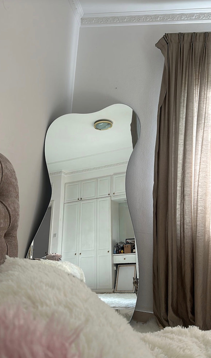 Make a statement with our Zhan Frameless Wavy Full-Length Mirror, designed to bring a bold, modern touch to any space. Featuring a fluid, organic wave shape, this mirror adds movement and elegance to bedrooms, dressing areas, or living spaces. Its versatile design allows it to be either leaned against the wall for a relaxed look or securely mounted for a sleek, floating effect. Crafted from high-quality glass for a clear, distortion-free reflection, this mirror is both functional and artistic, enhancing light and space effortlessly.